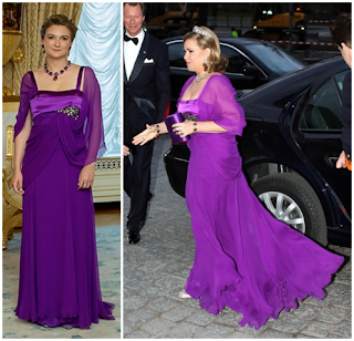 Our third clothes sharing moment comes courtesy of Hereditary Grand Duchess Stéphanie, at this year's national day, and Grand Duchess Maria Teresa, who wore this purple gown in 2008 for a state visit to Sweden. I have since learned thanks to the fabulous ladies over at UFO No More that this gown is actually by Elie Saab. Hmpf, I think we found the first Saab outfit that I really dislike! Someone call satan to tell him to get on his long johns, cause hell just might freeze over...